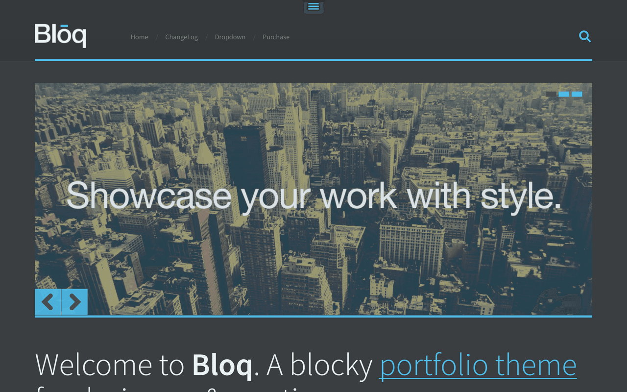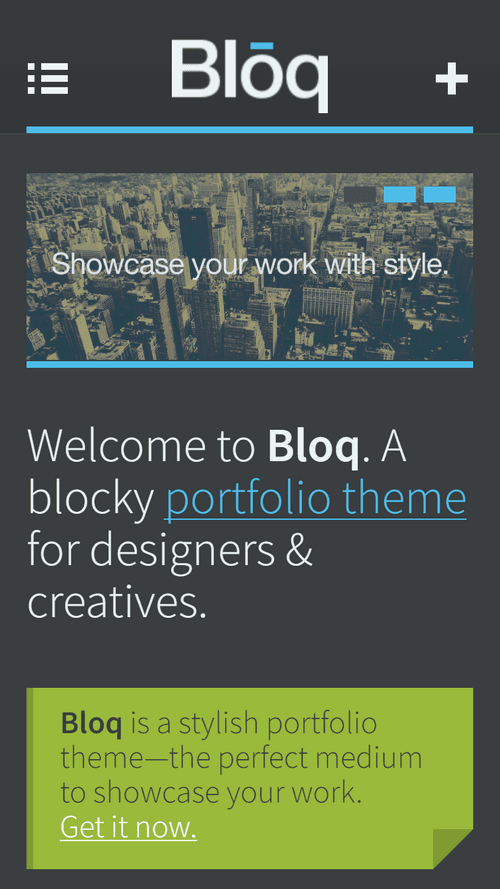 - Touch-optimized Homepage Slider: Bloq uses swipe.js, the most accurate touch slider. You can upload up to five images with their own caption and URL.